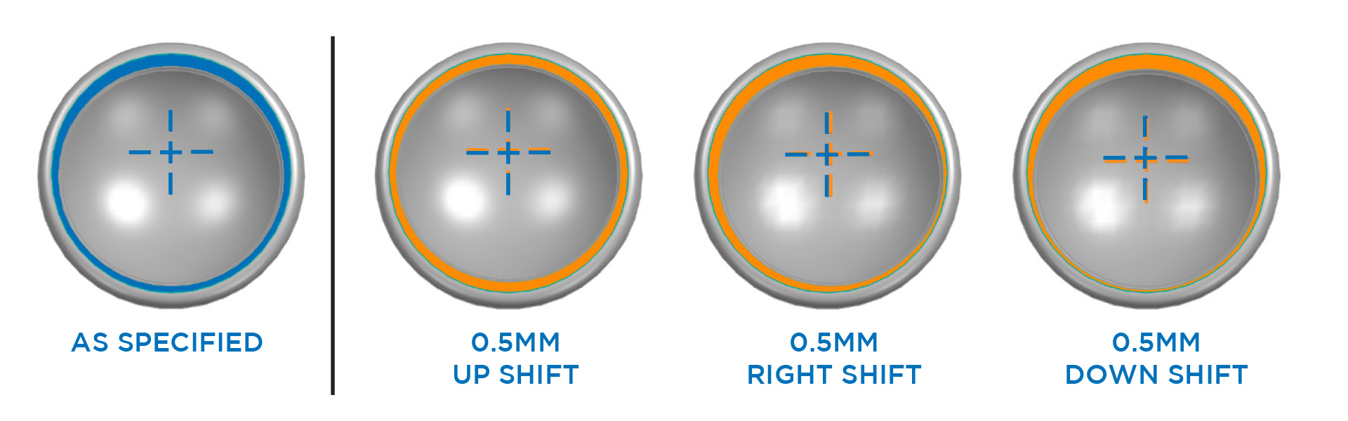 Die Oberfläche des Humerus-Inlays für inverse Schulterprothesen wird gezeigt: 1) wie spezifiziert und 2) mit drei möglichen Abweichungen der Fertigung vom Rotationszentrum. Blau kennzeichnet das spezifizierte Rotationszentrum, Orange kennzeichnet die verschobene Position.